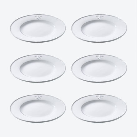 Die Lilie ist schon seit dem 12. Jahrhundert das Symbol der französischen Monarchie, in abstrahierter Form adelt sie neben Wappen auch Utensilien des täglichen Gebrauchs zu wahrhaft königlichen Accessoires. In plastisch fein hervorgehobener Darstellung ziert die heraldische Lilienblüte, auch als Fleur-de-Lys bekannt, dieses edle Fayence Geschirr. Der aufwendig gestaltete Kordelrand dient als passender Rahmen für liebevoll angerichtete Speisen. Genießen Sie täglich und bei festlichen Anlässen die dezent feudale Ausstrahlung dieses Geschirrs. Reinweiße Fayence, mikrowellengeeignet, spülmaschinenfest.
