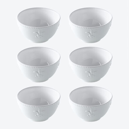 Die Lilie ist schon seit dem 12. Jahrhundert das Symbol der französischen Monarchie, in abstrahierter Form adelt sie neben Wappen auch Utensilien des täglichen Gebrauchs zu wahrhaft königlichen Accessoires. In plastisch fein hervorgehobener Darstellung ziert die heraldische Lilienblüte, auch als Fleur-de-Lys bekannt, dieses edle Fayence Geschirr. Der aufwendig gestaltete Kordelrand dient als passender Rahmen für liebevoll angerichtete Speisen. Genießen Sie täglich und bei festlichen Anlässen die dezent feudale Ausstrahlung dieses Geschirrs. Reinweiße Fayence, mikrowellengeeignet, spülmaschinenfest.