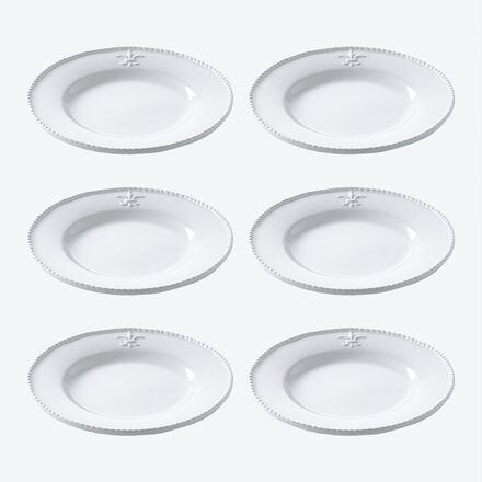 Die Lilie ist schon seit dem 12. Jahrhundert das Symbol der französischen Monarchie, in abstrahierter Form adelt sie neben Wappen auch Utensilien des täglichen Gebrauchs zu wahrhaft königlichen Accessoires. In plastisch fein hervorgehobener Darstellung ziert die heraldische Lilienblüte, auch als Fleur-de-Lys bekannt, dieses edle Fayence Geschirr. Der aufwendig gestaltete Kordelrand dient als passender Rahmen für liebevoll angerichtete Speisen. Genießen Sie täglich und bei festlichen Anlässen die dezent feudale Ausstrahlung dieses Geschirrs. Reinweiße Fayence, mikrowellengeeignet, spülmaschinenfest.