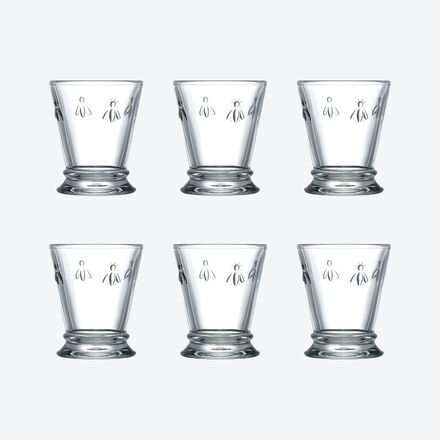 Beliebtes Wasserglas in charakteristischer Kelchform Charmantes Bienen-Symbol der Bonapartes In Frankreichs ältester Glasmanufaktur hergestellt Moderne Produktionsstandards Robust und spülmaschinenfest Klarglas oder farbiges Glas Für eine festliche Tafel oder einen geschmackvollen Esstisch Nach der Bourbonendynastie mit ihrer typischen Lilie wählte Kaiser Napoleon die Biene als neue Insignie seiner Macht. Als Wappentier der Bonapartes ist sie natürlich auch im Fundus der 1475 gegründeten Glasmanufaktur La Rochére zu finden. Charmant zieren die Bienen die beliebte Glasserie in charakteristischer Kelchform. Mit ihrem schlichten Design in klarem oder farbigem Glas schmücken die Wassergläser jeden Tisch – egal zu welchem Anlass. Die stabilen Bechergläser werden heutzutage nach modernen Produktionsstandards hergestellt, die höchste Ansprüche erfüllen und die Gläser robust und spülmaschinenfest machen.
