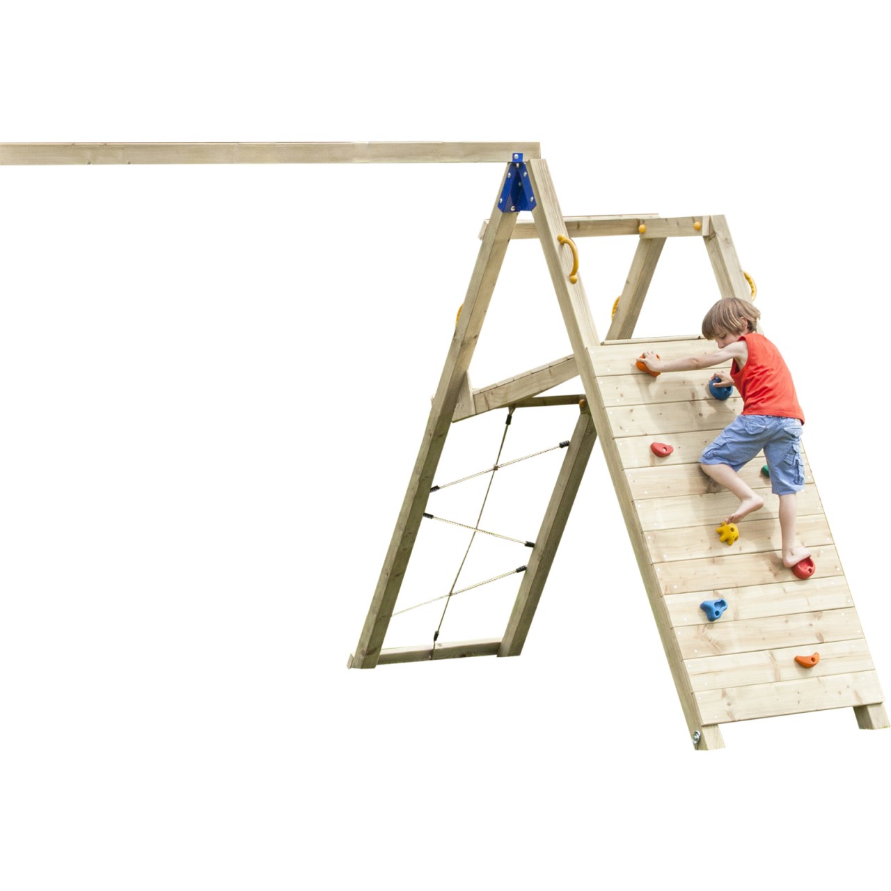 Viele Klettermöglichkeiten machen dieses Anbaumodul so interessant Das Klettermodul @CHALLENGER kann an jeden Blue Rabbit Spielturm montiert werden. Klettern wird eine echte Herausforderung mit einem Kletternetz, einer Kletterwand mit Klettersteinen sowie der seitlichen Kletterwand. Hier kommt wirklich keine lange Weile auf. Der extra lange Balken ermöglicht es, dass gleich 2 Schaukelsitze befestigt werden können. Die stabilen Schaukelschellen sind im Lieferumfang bereits enthalten. Abmessungen des Anbaumodul Kletterwand @CHALLENGER: Länge: 2,70 m, Schaukelhöhe: 2,34 m (genügend Beinfreiheit auch für größere Kinder) Sicherheitsabstand: 2 m Passend für Podesthöhen von 1,20 – 1,50 m Hochwertiges und wetterfestes Material Das schöne Anbaumodul für Ihren Blue Rabbit Spielturm besteht aus kesseldruckimprägniertem Kiefernholz, das Sie nicht zu streichen brauchen. Die Kletterwand ist wetterfest sowie sehr robust und Ihre Kids können nach Herzenslust daran spielen. Die glatten Oberflächen und runden Kanten sind optimal für zarte Kinderhände geeignet. Lieferumfang zum Anbaumodul Kletterwand @CHALLENGER: 1 Bausatz @CHALLENGER, 1 Schraubenpaket, 2 Grundanker, 8 Klettersteine, 4 Schaukelschellen, 4 Handgriffe, 1 Kletternetz 1 Premium Holzpaket @CHALLENGER, KIEFER kesseldruckimprägniert Perfektes Anbaumodul für kleine Abenteurer Machen Sie Ihren Kindern eine große Freude und bestellen Sie gleich die tolle Kletterwand zu Ihrem Spielturm von Blue Rabbit. Das Anbaumodul aus Holz bietet Kletterspaß pur und ist genau das Richtige für abenteuerlustige Kids. Stöbern Sie in Ruhe in unserem Onlineshop und entdecken Sie weitere schöne Anbaumodule für unsere Spieltürme . Ihre Kinder werden garantiert lange Zeit ihre Freude damit haben.