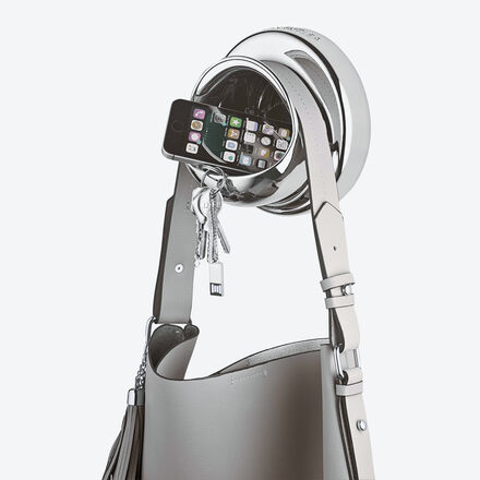 Kleiner Wand-Organizer zum Aufhängen einer Handtasche Mit Aufbewahrungsfach für wichtige Gegenstände Aus recycelbarem Kunststoff Glänzende Oberfläche Einfache Montage, Montagematerial inklusive Der runde Handtaschenhalter „Bagbutler“ ist dekorativ und praktisch zugleich. Befestigen Sie ihn einfach an der Wand in der Nähe Ihrer Wohnungstür und Sie haben bei der schnellen Routine beim Verlassen des Hauses alle wichtigen Accessoires parat. Ihre Handtasche hängen Sie über dem offenen Aufbewahrungsfach am ergonomisch geformten Riemenhalter rutschfest auf. Im kugelförmigen Fach verstauen Sie wichtige Gegenstände wie Schlüssel, Smartphone, Sonnenbrille oder Aufladekabel. Der Butler ist aus recycelbarem Kunststoff mit glänzender Oberfläche in Chrom-Optik gefertigt und wird montagefreundlich inklusive Schrauben und Abdeckkappe geliefert. Kunststoff recycelt, glänzende Oberfläche, Ø 16 x 10,5 cm tief, incl. Montagematerial.