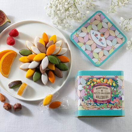 Traditionelles französisches Konfekt Aus hochwertigen, regionalen Zutaten Bunte Mischung mit 6 Geschmacksrichtungen Z. B. Kakao-Haselnuss, Orange, Zitrone, Himbeere Bekannt und in ganz Frankreich begehrt sind Calissons seit dem 15. Jahrhundert. Fein gemahlene, süße Mandeln, provenzalische Melone und Orangenschale aus der sonnenverwöhnten Umgebung von Aix-en-Provence sind wichtige Geschmackskomponenten des außergewöhnlichen Konfekts. Inspiriert von den bunten Farben des traditionellen Karnevals der Region bietet diese herrliche Mischung kleine, bunte Calissons in 6 köstlichen Geschmackrichtungen: Klassisch, Himbeere, Feige, Kakao-Haselnuss, Orange, Zitrone.