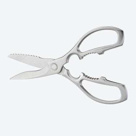 Dauerhaft scharfe, mikroverzahnte Klingen Zerteilt ganze Grillhähnchen, trennt Brokkoli vom Strunk Auch zum Entschuppen von Fischen, Zerteilen von Knochen Integrierter Kapselheber, Drehverschluss-Öffner, Nussknacker Für Rechts- und Linkshänder Ihre mikroverzahnten Klingen sorgen für dauerhafte Schärfe und sicheren Halt beim Schneiden. Mühelos und präzise zerteilen Sie mit der überaus robusten Edelstahl-Schere selbst ganze Grillhähnchen oder trennen Brokkoli-Röschen vom harten Strunk. Mit ihrer gezahnten Kante entschuppen Sie ganze Fische, eine Vertiefung in der Klinge ermöglicht das Zerteilen von Knochen. Mit integriertem Kapselheber, Drehverschluss-Öffner bis Ø 3 cm, Nussknacker. Geeignet für Rechts- und Linkshänder. Edelstahl, 8,5 x 22,5 x 1 cm (B/T/H), zum Erhalt der Schärfe Handwäsche empfohlen.
