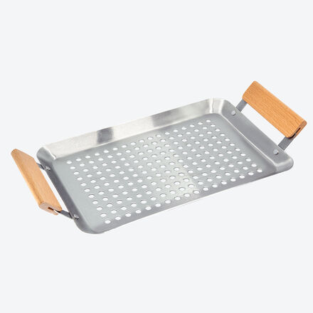 Schützt Grillgut vor Verbrennen, Herunterfallen Perfektes Garen, einfaches Wenden Gleichmäßige Hitzeverteilung Aus hochwertigem Edelstahl Mit abnehmbaren Griffen aus Buchenholz Sicher und sauber grillen Sie darauf Empfindliches wie Fisch und Spargel, aber auch Spießchen, Würste. Schonend lässt sich das Grillgut garen und wenden, nichts fällt durch den Rost oder verbrennt. Für eine gleichmäßige Hitzeverteilung und beste Grillergebnisse sorgt der hochwertige, lebensmittelgerechte Edelstahl. Durch die gleichmäßige Perforation erhält das Grillgut sein feines, grilltypisches Aroma. Sichere Griffe erleichtern den Transport. Geeignet für alle gängigen Grillarten. Schale Edelstahl, abnehmbare Griffe Buchenholz, 34 x 18,5 x 4,5 cm (B/T/H), spülmaschinenfest (nur Schale).