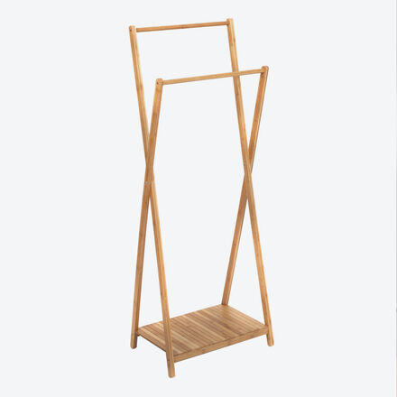 Kammerdiener schafft mehr Platz und Ordnung Aus nachhaltigem Bambusholz Mit 2 Kleiderstangen und Schuhablage Funktionales Design Viele Einsatzmöglichkeiten Stets zur Stelle ist die mobile Bambus-Garderobe und bietet Ihnen zusätzlichen Stauraum für Ihre Kleidung, Bademäntel, Bügelwäsche oder Mäntel und Jacken. Nutzen Sie die beiden Stangen, um Kleidung zu lüften, Outfits für den nächsten Tag vorzubereiten oder frisch Gebügeltes aufzuhängen. Auf der Ablagefläche stellen Sie Schuhe ab oder einen dekorativen Korb für Accessoires wie Handschuhe oder Mützen. Der Kammerdiener im funktionellen Design wird flach geliefert und ist mit den enthaltenen Schrauben und Anleitung einfach zu montieren. Das nachhaltige Bambusholz ist mit einem Satinlack versehen und bereichert Ihren Wohnraum mit seiner warmen Ausstrahlung. Bambusholz, 60 x 34 x 142/162 cm (B/T/H), muss montiert werden.