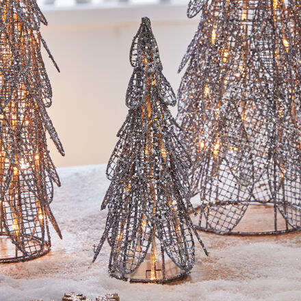 Das „Nadelkleid“ der dekorativen Tannenbäume ist aus silberfarbenem Metall- Geflecht gefertigt und mit aufliegendem Silberglitter versehen. So glitzern die winter- und weihnachtlichen Accessoires festlich im warmweißen Schein der innen befestigten LED-Lichterkette. Mit standfestem, kegelförmigem Korpus, nur für den Innenbereich geeignet. Klein (S): Ø 10 cm, 26 cm hoch, 20 LEDs, benötigt 2 AA-Batterien (nicht im Lieferumfang enthalten). Mittel (M): Ø 15 cm, 46 cm hoch, 30 LEDs. Groß (L): Ø 20 cm, 66 cm hoch, 40 LEDs. Größen M + L mit Transformator, A bis A++. Transparentes 5 m Anschlusskabel im Lieferumfang enthalten.