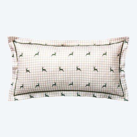 Vichykaro mit aufgedruckten Hirschen Zeitloser Chalet-Chic Kissenhüllen mit Stehsaum und Ziernaht Bettbezug und Kissenhüllen in der Größe Ihrer Wahl bestellbar Seidiges Mako-Satin deutscher Atelierkonfektion werden die passenden Kissenbezüge für die Bettbezüge im Chalet-Chic mit einem aufwendigen Stehsaum und einem farblich abgestimmten Zierstich gearbeitet. Bitte bestellen Sie die Bettbezüge in der Größe Ihrer Wahl separat. So stellen Sie sicher, dass Sie den Bettbezug bekommen, der zu Ihrer Decke zuhause perfekt passt. Die im feinen beigen Vichykaro gemusterte Satin-Bettwäsche ist aus glattem, seidigem Mako-Satin. Symmetrisch bedruckt mit unzähligen roten Hirschen dekorieren die Bettwaren Ihr Schlafzimmer im zeitlosen Chalet-Stil. Sondergrößen der Kollektion sind auf Anfrage möglich. Gefertigt in Deutschland. 100 % Baumwolle, Öko-Tex Standard 100, mit Reißverschluss, Maschinenwäsche 60 °C, trocknergeeignet.