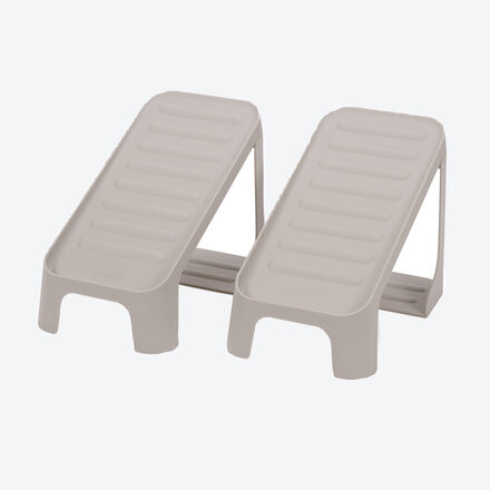 2er-Set Schuhablage Kompakte Aufbewahrung für 1 Paar Schuhe Innovatives Stufendesign mit klappbarer oberer Ebene Rutschhemmende Oberfläche Für verschiedene Schuhtypen geeignet In der kompakten Schuhaufbewahrung mit innovativem Stufendesign bewahren Sie ein Paar Schuhe platzsparend übereinander auf, ohne dass sie sich berühren. Jedes Modul bietet Platz für ein Paar Schuhe – die obere Ebene ist hochklappbar und ermöglicht so ein besonders einfaches Handling. Die geriffelte Oberfläche verhindert ein Verrutschen der Schuhe, egal ob Sneaker, Ballerinas oder Slipper. Das Material ist pflegeleicht und abwischbar, ideal für den Alltag. Ob für kleine Wohnungen, Familienhaushalte oder einfach mehr Übersicht im Schuhschrank: Dieses praktische Schuhregal spart Platz und schafft sofort Ordnung. Kunststoff, Ecru, B/H/T ca. 15/18/26 cm.