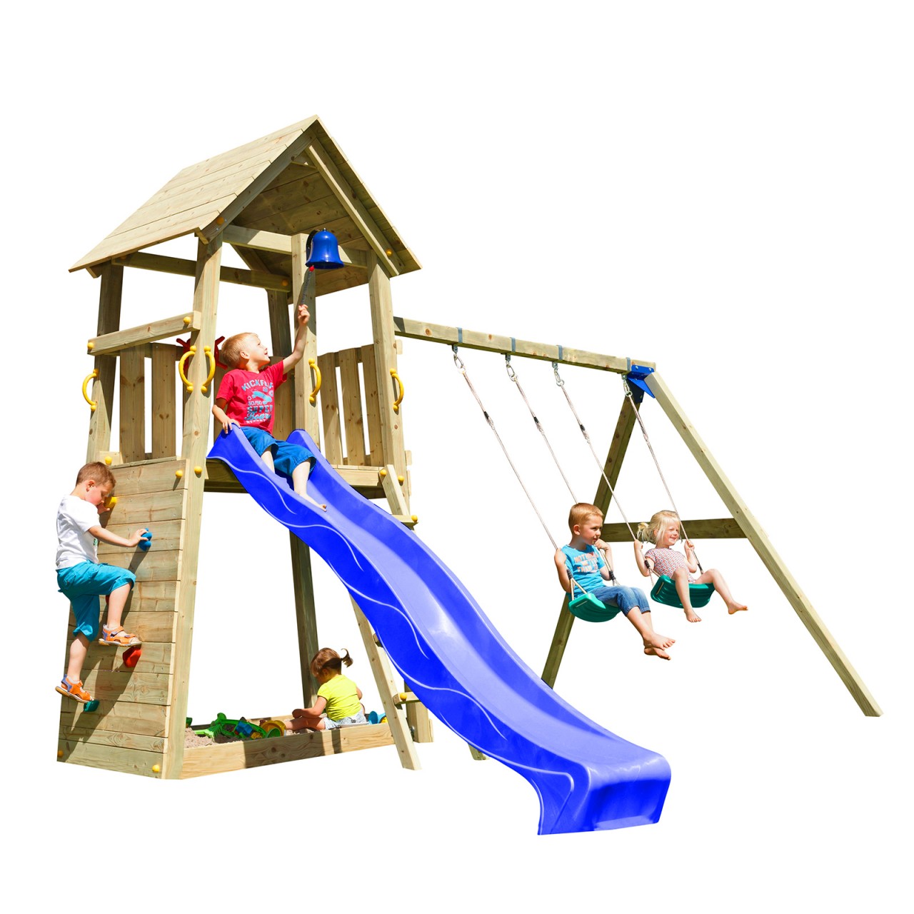 Spielturm BELVEDERE mit vielen schönen Details Schaffen Sie Ihren Kindern ein kleines Spielparadies im Garten mit dem Spielturm BELVEDERE . Der schöne Turm ermöglicht stundenlanges Spielen und Toben im Garten ohne Langeweile. Hier erhalten Sie einen Bausatz und das passende Holz für ein kleines Spielparadies mit Spielhaus, Rutsche und Doppelschaukel. Der einmalige Vorteil dieser Doppelschaukel ist die Höhe. Details zum Spielturm BELVEDERE mit Doppelschaukel und Rutsche: Außenmaß komplett inkl. Rutsche 2,30 m (B x T x H): 4,10 x 3,73 x 2,99 cm Außenmaß komplett inkl. Rutsche 2,90 m (B x T x H): 4,10 x 4,39 x 3,29 cm Sandkasten (B x T x H): 1,35 x 1,05 x 1,20 m / 1,50 m Podesthöhe: 1,20 m / 1,50 m Rutschenlänge: 2,30 m / 2,90 m Kesseldruckimprägniertes Massivholz Massives Holzdach, Kletterwand 10 Jahre Händlergarantie Sofortiger Aufbau garantiert GRATIS Zubehörpaket Lieferumfang zum Spielturm BELVEDERE mit Doppelschaukel und Rutsche: 4 Grundkanker 2 Schraubenpakete 5 Sicherheitshandgriffe 1 Satz Klettersteine 2 Schaukelschellen vierkant aus feuerverzintem Stahl mit Karabiner 3 Verbindungsbeschläge 1 integrierter Sandkasten 1 GRATIS Zubehörpaket 2 Schaukelsitze mit Seil aus HDPE Türkis, Belastbarkeit: 70 kg 1 Wellenrutsche mit Wasseranschluss Rot, Gelb, Blau oder Grün, Länge: 2,30 m oder 2,90 m, Belastbarkeit: 70 kg 2 Holzpakete Premium kesseldruckimprägniert Spielturm BELVEDERE: stabil, sicher und langlebig Hier erhalten Sie einen Bausatz, um Ihren Kindern einen Erlebnisspielplatz zu bauen. Das Material ist hochwertig und robust und wird sorgfältig verarbeitet. Das Spielgerät ist wetterfest und erfordert keinen weiteren Anstrich. So erhalten Sie mit dem Spielturm BELVEDERE einen sicheren, robusten und langlebigen Turm für Ihren Garten. Viele Möglichkeiten zum Spielen und Toben Der Spielturm BELVEDERE hat eine Grundfläche von 1,05 x 1,05 m. Über eine Leiter kann das klassische Spielhaus erobert werden. Auch die Rutsche ist von hier aus zugänglich. Mit verspielten Details wie der blauen Glocke und dem Schiffslenkrad können sich Ihre Kleinen austoben und weitere Spielmöglichkeiten entdecken.