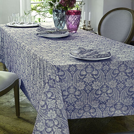 Auf Original-Webstühlen aus dem 19. Jahrhundert wird diese italienische Halbleinen-Damasttischwäsche in Jacquard-Technik individuell gefertigt. Die Konturen des großflächigen floralornamentalen Renaissance-Dekors treten plastisch und schillernd hervor. Die Tischwäsche vereint die Vorzüge von Leinen und Baumwolle zu einem wunderbar griffigen und robusten, dabei jedoch weichen und feinen Stoff. Von Hand eingezogener Hohlund 3 cm breiter Couvertsaum. 60 % Leinen, 40 % Baumwolle, Maschinenwäsche 40 °C. Bitte nennen Sie Ihren Farbwunsch: Altrosa, Rauchblau. Auf Wunsch sind Maßanfertigungen möglich.