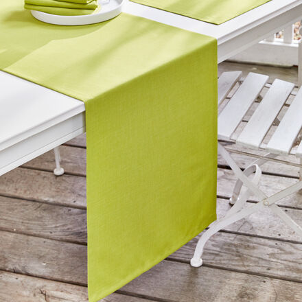 Unifarbener Tischläufer Edle Leinenoptik Gut zu kombinieren Passt toll zu farbenfrohem Geschirr Die einfarbige Tischwäsche ist eine frische Grundlage für festliche Tischdekorationen oder farbenfrohes Geschirr. Die Leinenoptik mit edler Schattierung entsteht durch die leicht unterschiedliche Farbe von Kett- und Schussfaden. Dank eines speziellen Fleckenschutzes perlen Flüssigkeiten einfach vom Gewebe ab oder können leicht abgewischt werden. Der einfarbige Tischläufer ergänzt viele Tischdekorationen mit seiner frischen Farbe. Besonders gut lässt er sich Ton-in-Ton mit der pflegeleichten, schlichten Tischwäsche-Serie Uni kombinieren. Zum Erhalt des Fleckschutzes, der durch mechanischen Abrieb in der Waschtrommel verloren gehen kann, empfehlen wir die Wäsche im Wäschesack (oder Kissenbezug). 100 % Polyester, Maschinenwäsche 60 °C.